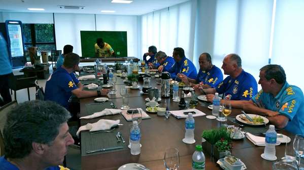 (CBF), é possível observar os jogadores brasileiros assistindo atentamente à partida, ao lado de Felipão, Murtosa, Parreira e companhia.